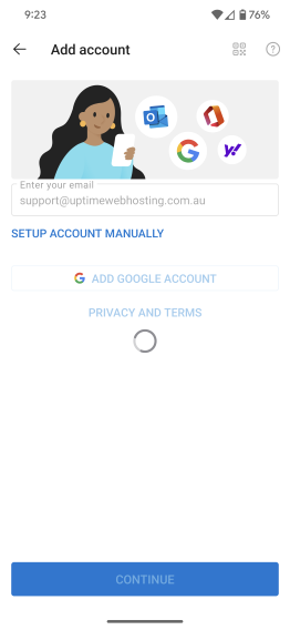 - Enter your email address and tap on the continue button. You can also tap on the SetUp Account Manually option when it appears.